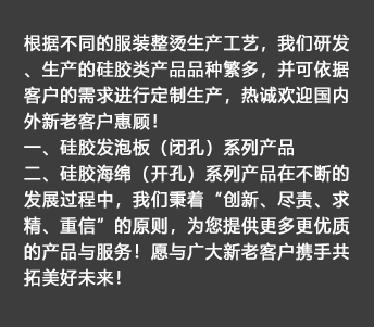 ????我公司生產(chǎn)的硅膠海綿具有耐高溫、耐壓、透氣性能好、抗撕拉、使用壽命長、環(huán)保等特點(diǎn),主要適用于服裝干洗、水洗熨燙設(shè)備,如壓燙機(jī)和燙臺等。另外我們也提供各種燙氈、罩布等整燙專用墊料,客戶可根據(jù)不同熨燙工藝選擇不同的搭配組合,滿足高品質(zhì)的熨燙要求。